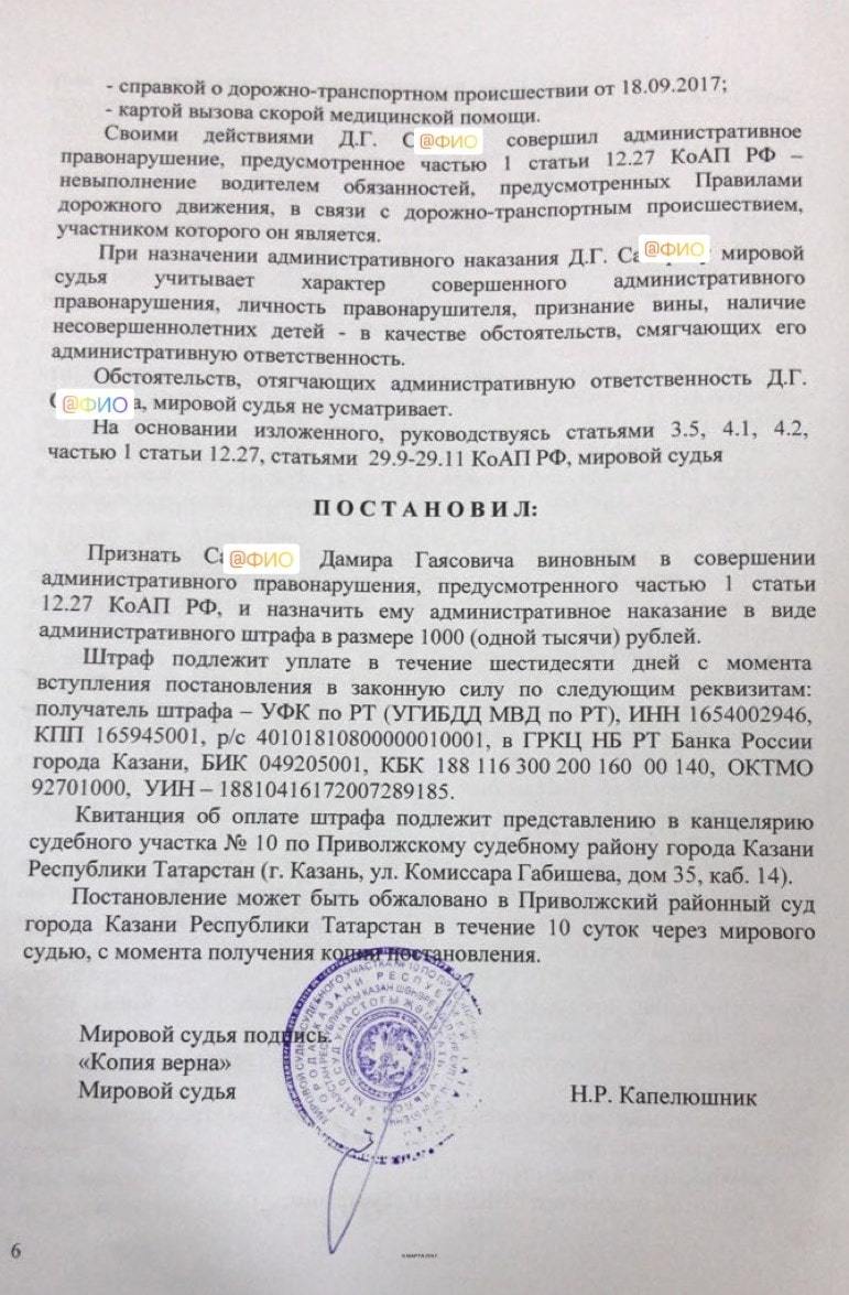 Выигранные решения по ст. 12.27 КоАП РФ